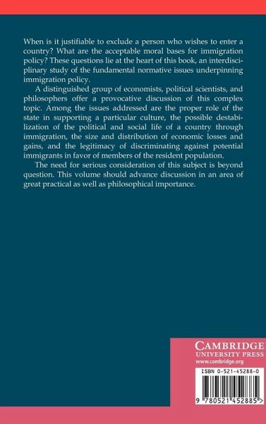 When is it justifiable to exclude a person who wishes to enter a country? What are the acceptable moral bases for immigration policy? These questions lie at the heart of this book, the first interdisciplinary study of the fundamental normative issues underpinning immigration policy. A distinguished group of economists, political scientists, and philosophers offer a provocative discussion of this complex topic. Among the issues addressed are the proper role of the state in supporting a particular culture, the possible destabilization of the political and social life of a country through immigration, the size and distribution of economic losses and gains, and the legitimacy of discriminating against potential immigrants in favor of members of the resident population. The need for serious consideration of this subject is beyond question. This volume should advance discussion in an area of great practical as well as philosophical importance.