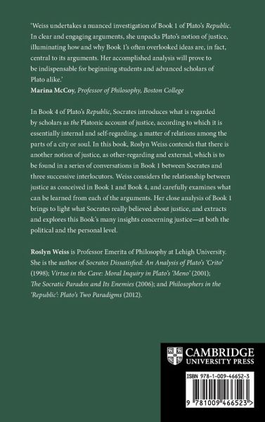 In Book 4 of Plato's Republic, Socrates introduces what is regarded by scholars as the Platonic account of justice, according to which it is essentially internal and self-regarding, a matter of relations among the parts of a city or soul. In this book, Roslyn Weiss contends that there is another notion of justice, as other-regarding and external, which is to be found in a series of conversations in Book 1 between Socrates and three successive interlocutors. Weiss considers the relationship between justice as conceived in Book 1 and Book 4, and carefully examines what can be learned from each of the arguments. Her close analysis of Book 1 brings to light what Socrates really believed about justice, and extracts and explores this Book's many insights concerning justice-at both the political and the personal level.