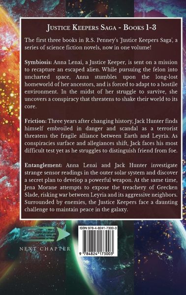 The first three books in R.S. Penney's 'Justice Keepers Saga', a series of science fiction novels, now in one volume! Symbiosis: Anna Lenai, a Justice Keeper, is sent on a mission to recapture an escaped alien. While pursuing the felon into uncharted space, Anna stumbles upon the long-lost homeworld of her ancestors, and is forced to adapt to a hostile environment. In the midst of her struggle to survive, she uncovers a conspiracy that threatens to shake their world to its core. Friction: Three years after changing history, Jack Hunter finds himself embroiled in danger and scandal as a terrorist threatens the fragile alliance between Earth and Leyria. As conspiracies surface and allegiances shift, Jack faces his most difficult test yet as he struggles to distinguish friend from foe. Entanglement: Anna Lenai and Jack Hunter investigate strange sensor readings in the outer solar system and discover a secret plan to develop a powerful weapon. At the same time, Jena Morane attempts to expose the treachery of Grecken Slade, risking war between Leyria and its aggressive neighbors. Surrounded by enemies, the Justice Keepers face a daunting challenge to maintain peace in the galaxy.