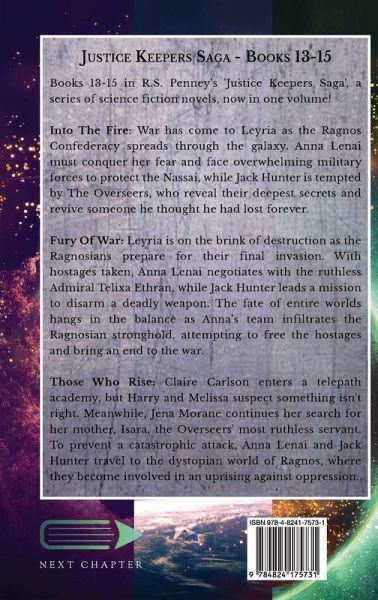 Books 13-15 in R.S. Penney's 'Justice Keepers Saga', a series of science fiction novels, now in one volume! Into The Fire: War has come to Leyria as the Ragnos Confederacy spreads through the galaxy. Anna Lenai must conquer her fear and face overwhelming military forces to protect the Nassai, while Jack Hunter is tempted by The Overseers, who reveal their deepest secrets and revive someone he thought he had lost forever. Fury Of War: Leyria is on the brink of destruction as the Ragnosians prepare for their final invasion. With hostages taken, Anna Lenai negotiates with the ruthless Admiral Telixa Ethran, while Jack Hunter leads a mission to disarm a deadly weapon. The fate of entire worlds hangs in the balance as Anna's team infiltrates the Ragnosian stronghold, attempting to free the hostages and bring an end to the war. Those Who Rise: Claire Carlson enters a telepath academy, but Harry and Melissa suspect something isn't right. Meanwhile, Jena Morane continues her search for her mother, Isara, the Overseers' most ruthless servant. To prevent a catastrophic attack, Anna Lenai and Jack Hunter travel to the dystopian world of Ragnos, where they become involved in an uprising against oppression.