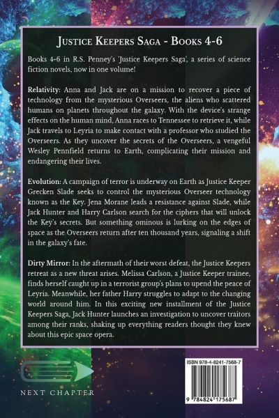 Books 4-6 in R.S. Penney's 'Justice Keepers Saga', a series of science fiction novels, now in one volume! Relativity: Anna and Jack are on a mission to recover a piece of technology from the mysterious Overseers, the aliens who scattered humans on planets throughout the galaxy. With the device's strange effects on the human mind, Anna races to Tennessee to retrieve it, while Jack travels to Leyria to make contact with a professor who studied the Overseers. As they uncover the secrets of the Overseers, a vengeful Wesley Pennfield returns to Earth, complicating their mission and endangering their lives. Evolution: A campaign of terror is underway on Earth as Justice Keeper Grecken Slade seeks to control the mysterious Overseer technology known as the Key. Jena Morane leads a resistance against Slade, while Jack Hunter and Harry Carlson search for the ciphers that will unlock the Key's secrets. But something ominous is lurking on the edges of space as the Overseers return after ten thousand years, signaling a shift in the galaxy's fate. Dirty Mirror: In the aftermath of their worst defeat, the Justice Keepers retreat as a new threat arises. Melissa Carlson, a Justice Keeper trainee, finds herself caught up in a terrorist group's plans to upend the peace of Leyria. Meanwhile, her father Harry struggles to adapt to the changing world around him. In this exciting new installment of the Justice Keepers Saga, Jack Hunter launches an investigation to uncover traitors among their ranks, shaking up everything readers thought they knew about this epic space opera.