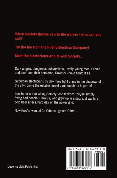 When Society throws you to the wolves - who can YOU call? Dial the trio from the Firefly Electrics Company. Meet the electricians who re-wire Society today in these crime-noir thrillers with a dark humour twist. Dark angels, dangerous subversives, lovely young men. Lennie and Joe, abetted by their sharp-tongued cockatoo Rawcus, have heard it all. Electricians by day, they fight crime in the shadows of the city; crime the Establishment can't touch - or is part of! Lennie calls it re-wiring Society. Joe reckons they're simply fixing bad people. Rawcus, who grew up in a pub, just wants a cold beer after a hard day on the power grid. Now they're wanted for Crimes against Crime. In Justice Machine, Lennie and Joe thank their lucky stars when they are fishing at dawn on a city wharf and a small fortune falls from the sky into their laps during a cargo-loading accident. They escape without being ID'd, and know exactly how to distribute the windfall. But they've triggered a manhunt that threatens to blow their world apart... When Lennie's ex-parole officer, Trixi Talaveda, drops into their home for a chat about the missing cash, accompanied by a pair of human bulls called the Enoka brothers, life becomes trickier than ever. Will this new peril derail their plans to re-educate a "trusted financial adviser" who persuaded Lennie's beloved Aunty Doreen that money really did "grow on trees" - and drove her to the grave? Might a sea voyage with Aunty D's tormentor aboard their little yacht, Flamingo Sky, solve all their problems? Or might it all end in disaster? In Justice Machine, as Lennie explains to their reluctant shipmate: "A machine isn't only a bunch of nuts and bolts...it's a word for a process that transforms things." "These eccentric inner-city Sydney crusaders, created by crime suspense master Mark Furness, are a whole new adventure in crime capers and my favourite series of the year...quirky and refreshingly wry." Tom Flood, Winner of the Miles Franklin Award, Australia's equivalent of the US Pulitzer Prize for Fiction and the UK Booker Prize. "Redolent of Lord Of The Flies and Of Mice And Men...A post-Zen Batman and Robin...Lennie and Joe, and their pet, Rawcus, configure a doctorate in elegant, fair-minded Gonzo retribution of the order of Pulp Fiction..." Clare Allan-Kamil, Writers Victoria. "I have been reading crime fiction from bestsellers to hidden gems for many years and I have never...NEVER read anything as imaginative and humorous in such a uniquely Australian larrikin voice as Mark Furness' work." Mark Droic, Goodreads.