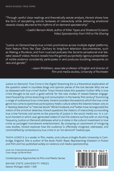 Justice on Demand: True Crime in the Digital Streaming Era offers a theoretical rumination on the question asked in countless blogs and opinion pieces of the last decade: Why are we so obsessed with true crime? Author Tanya Horeck takes this question further: Why is true crime thought to be such a good vehicle for the new modes of viewer/listener engagement favored by online streaming and consumption in the twenty-first century? Examining a range of audiovisual true crime texts, from podcasts such as Serial and My Favorite Murder to long-form crime documentaries such as The Jinx and Making a Murderer, Horeck considers the extent to which the true crime genre has come to epitomize participatory media culture where the listener/viewer acts as a "desktop detective" or "internet sleuth." While Facebook and Twitter have re-invigorated the notion of the armchair detective, Horeck questions the rhetoric of interactivity surrounding true crime formats and points to the precarity of justice in the social media era. In a cultural moment in which user-generated videos of real-life violence surface with an alarming frequency, Justice on Demand addresses what is at stake in the cultural investment in true crime as packaged mainstream entertainment. Paying close attention to the gendered and racialized dimensions of true crime media, Horeck examines objects that are not commonly considered "true crime," including the subgenre of closed-circuit television (CCTV) elevator assault videos and the popularity of trailers for true crime documentaries on YouTube. By analyzing a range of intriguing case studies, Horeck explores how the audience is affectively imagined, addressed, and commodified by contemporary true crime in an "on demand" mediascape. As a fresh investigation of how contemporary variations of true crime raise significant ethical questions regarding what it means to watch, listen, and "witness" in a digital era of accessibility, immediacy, and instantaneity, Justice on Demand will be of interest to film, media, and digital studies scholars.