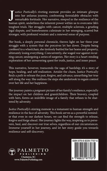 Unveiling the Journey of Resilience: A Triumphant Tale of Overcoming Cancer, Legal Battles, Homelessness, and Finding Inner Peace Amidst Adversities. Justice Poetically's compelling narrative offers an intimate look into her inspiring journey, facing daunting challenges with extraordinary resilience. Her story is a testament to the indomitable human spirit, revealing the profound strength that lies within each one of us. As she navigates through the trials of cancer, multiple sclerosis, an exhaustive legal battle, and homelessness, she emerges with unfathomable resilience, wisdom, and a deep sense of purpose. In this deeply personal narrative, Justice Poetically brings to light her three-year confrontation with a system she believes failed her. Despite being wheelchair-bound, she fought tirelessly for her home and property, only to lose it all. Simultaneously, she was battling her recurring cancer, going through operation after operation. This book is a poignant exploration of her relentless pursuit of truth, justice, and ultimately, her peace. However, this is more than a tale of struggle; it's a narrative of hope, healing, and self-discovery. Amidst the tumultuous events, Justice Poetically finds a way to let go of the past, forgive, and move forward, discovering her true self in the process. Through her words, she shares the steps she took to regain control of her life and happiness. Her journey is a deeply moving account of her family's resilience, particularly the impact on her children and grandchildren. Their bravery and resilience, alongside her own, create an unforgettable portrait of a family refusing to be broken by adversity. Justice Poetically's compelling memoir will inspire readers to find their strength and resilience in the face of life's most challenging trials. This book serves as a powerful reminder that even in the darkest hours, we can find the courage to let go, forgive, and move forward. Through her journey, she provides a beacon of hope, inspiring us all to persevere, heal, and uncover the real us, no matter the circumstances. Experience her journey and let her story inspire your own path to resilience and self-discovery.