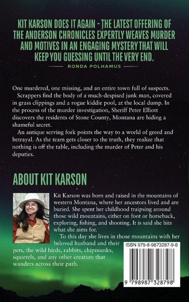 One murdered, one missing, and an entire town full of suspects. Scrappers find the body of a much-despised junk man, covered in grass clippings and a rogue kiddie pool, at the local dump. In the process of the murder investigation, Sheriff Peter Elliott discovers the residents of Stone County, Montana are hiding a shameful secret. An antique serving fork points the way to a world of greed and betrayal. Nothing is off the table, including the murder of Peter and his deputies and the team risks losing one of their own as they get closer to the truth.
