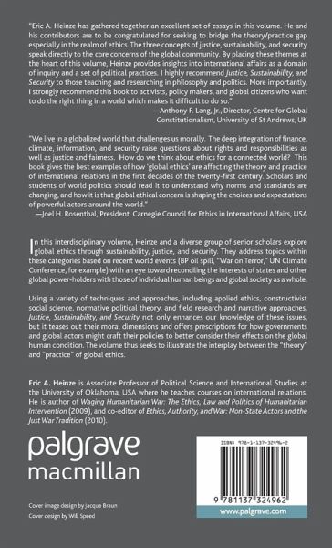 "Eric Heinze has gathered together an excellent set of essays in this volume. He and his contributors are to be congratulated for seeking to bridge the theory/practice gap especially in the realm of ethics. The three concepts of justice, sustainability and security speak directly to the core concerns of the global community. By placing these themes at the heart of this volume, it provides insights into international affairs as a domain of inquiry and a set of political practices. I highly recommend Justice, Sustainability, and Security to those teaching and researching in philosophy and politics. More importantly, I strongly recommend this book to activists, policy makers, and global citizens who want to do the right thing in a world which makes it difficult to do so." - Anthony F Lang, Jr., Director,