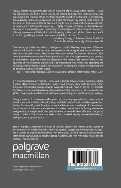 "Eric Heinze has gathered together an excellent set of essays in this volume. He and his contributors are to be congratulated for seeking to bridge the theory/practice gap especially in the realm of ethics. The three concepts of justice, sustainability and security speak directly to the core concerns of the global community. By placing these themes at the heart of this volume, it provides insights into international affairs as a domain of inquiry and a set of political practices. I highly recommend Justice, Sustainability, and Security to those teaching and researching in philosophy and politics. More importantly, I strongly recommend this book to activists, policy makers, and global citizens who want to do the right thing in a world which makes it difficult to do so." - Anthony F Lang, Jr., Director,
