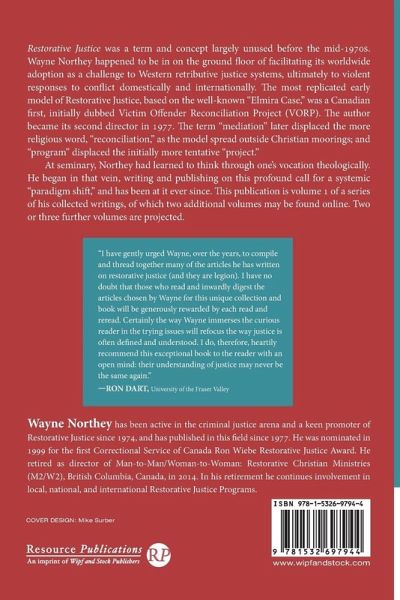 Restorative Justice was a term and concept largely unused before the mid-1970s. Wayne Northey happened to be in on the ground floor of facilitating its worldwide adoption as a challenge to Western retributive justice systems, ultimately to violent responses to conflict domestically and internationally. The most replicated early model of Restorative Justice, based on the well-known ""Elmira Case,"" was a Canadian first, initially dubbed Victim Offender Reconciliation Project (VORP). The author became its second director in 1977. The term ""mediation"" later displaced the more religious word, ""reconciliation,"" as the model spread outside Christian moorings; and ""program"" displaced the initially more tentative ""project."" At seminary, Northey had learned to think through one's vocation theologically. He began in that vein, writing and publishing on this profound call for a systemic ""paradigm shift,"" and has been at it ever since. This publication is volume 1 of a series of his collected writings, of which two additional volumes may be found online. Two or three further volumes are projected.