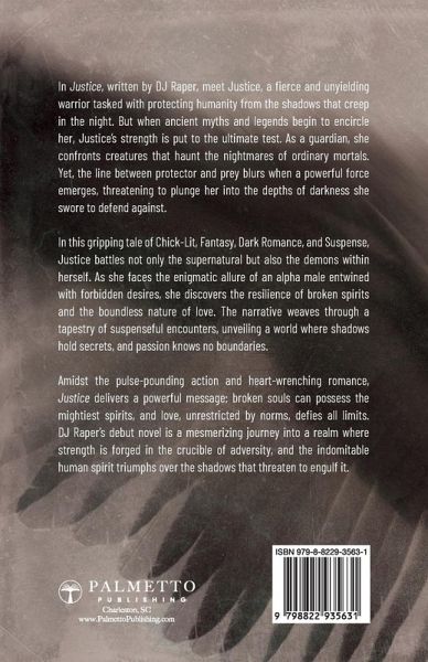 Unleash the Warrior Within: Fearless Guardian Faces Mythic Horrors in an Epic Tale of Dark Romance and Unbridled Power. Dive into the mesmerizing world of Justice, where the shadows pulse with secrets, and a relentless guardian battles both mythical horrors and the allure of forbidden desires. In this spellbinding fusion of Chick-Lit, Fantasy, and Dark Romance, DJ Raper introduces Justice, a strong female warrior standing between humanity and the creatures of myth. Justice is not just a novel; it's an exhilarating journey through the realms of suspense and passion. Meet Justice, a guardian with an indomitable spirit, tasked with protecting us mere mortals from the things that go bump in the night. As she faces supernatural creatures that haunt the darkest corners of our nightmares, Justice discovers that the line between protector and prey is razor-thin. The narrative unfolds into a riveting dance of power and passion, where an alpha male with a mysterious past intertwines with Justice's fate. Will she succumb to the allure of forbidden love, or will she emerge victorious over the encroaching darkness? The answer lies within the pages of Justice, a tale that not only explores the boundaries of love but also delves into the resilience of broken spirits. Two worlds collide in this epic saga-one of mythical horrors and the other of unbridled romance. As the story unfolds, readers will find themselves captivated by the strength of Justice, a heroine whose journey reflects the triumph of the human spirit over the shadows that threaten to consume it.