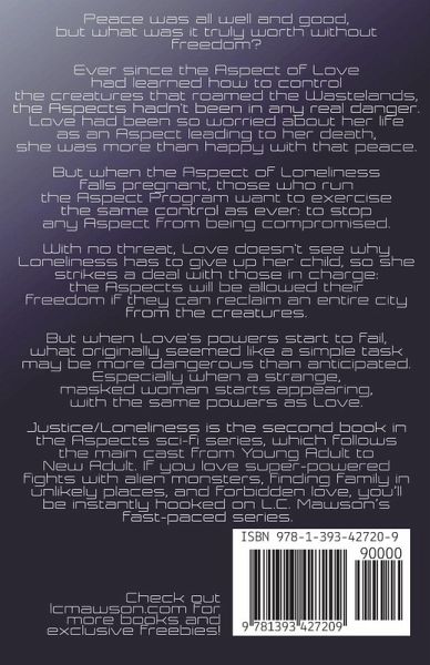 Peace was all well and good, but what was it truly worth without freedom? Ever since the Aspect of Love had learned how to control the creatures that roamed the Wastelands, the Aspects hadn't been in any real danger. Love had been so worried about her life as an Aspect leading to her death, she was more than happy with that peace. But when the Aspect of Loneliness falls pregnant, those who run the Aspect Program want to exercise the same control as ever: to stop any Aspect from being compromised. With no threat, Love doesn't see why Loneliness has to give up her child, so she strikes a deal with those in charge: the Aspects will be allowed their freedom if they can reclaim an entire city from the creatures. But when Love's powers start to fail, what originally seems like a simple task may be more dangerous than anticipated. Especially when a strange, masked woman starts appearing, with the same powers as Love. Justice/Loneliness is the second book in the Aspects YA sci-fi series.