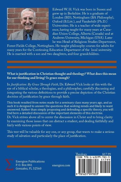 What is justification in Christian thought and theology? What does this mean for our thinking and living? Is grace enough? In Justification: By Grace Through Faith, Dr. Edward Vick looks at this with the eye of a biblical scholar, a theologian, and a philosopher, carefully discussing and integrating the various definitions to provide a precise depiction of the Christian doctrine of justification by grace through faith. This book resulted from notes made for a seminary class many years ago, and as such it is designed to answer the questions that seeking minds and likely to want answered. Rather than simply proposing and defending a specific theory, you will find here a detailed discussion of the important elements of this doctrine. Dr. Vick strives above all to center the discussion in Christ and to bring clarity by examining those issues that can distract a student, and dealing faithfully and fairly with various points of view. This text will be valuable for any one, or any group, that wants to make a serious study of salvation and particularly the place of justification.