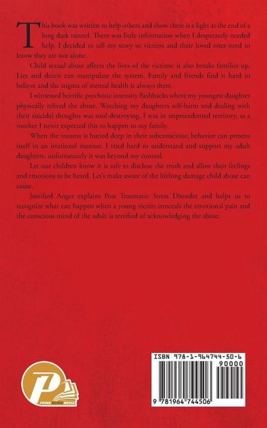 This book was written to help others and show there is a light at the end of a long dark tunnel. There was little information when I desperately needed help. I decided to tell my story so victims and their loved ones need to know they are not alone. Child sexual abuse affects the lives of the victims; it also breaks families up. Lies and deceit can manipulate the system. Family and friends find it hard to believe and the stigma of mental health is always there. I witnessed horrific psychotic intensity flashbacks where my youngest daughter physically relived the abuse. Watching my daughters self-harm and dealing with their suicidal thoughts was soul-destroying, I was in unprecedented territory, as a mother I never expected this to happen to my family. When the trauma is buried deep in their subconscious; behavior can present itself in an irrational manner. I tried hard to understand and support my adult daughters, unfortunately it was beyond my control. Let our children know it is safe to disclose the truth and allow their feelings and emotions to be heard. Let's make aware of the lifelong damage child abuse can cause. Justified Anger explains Post Traumatic Stress Disorder and helps us to recognize what can happen when a young victim conceals the emotional pain and the conscious mind of the adult is terrified of acknowledging the abuse.