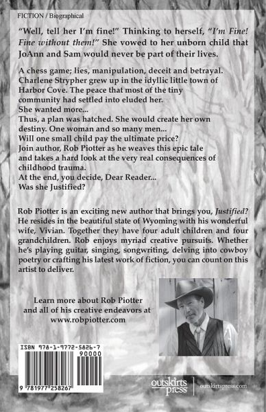 A chess game; lies, manipulation, deceit and betrayal. Charlene Strypher grew up in the idyllic little town of Harbor Cove. The peace that most of the tiny community had settled into eluded her. She wanted more... Thus, a plan was hatched. She would create her own destiny. One woman and so many men... Will one small child pay the ultimate price? Join author, Rob Piotter as he weaves this epic tale and takes a hard look at the very real consequences of childhood trauma. At the end, you decide, Dear Reader... Was she Justified?