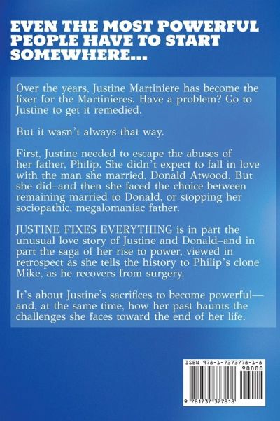 EVEN THE MOST POWERFUL PEOPLE HAVE TO START SOMEWHERE... Over the years, Justine Martiniere has become the fixer for the Martinieres. Have a problem? Go to Justine to get it remedied. But it wasn't always that way. First, Justine needed to escape the abuses of her father, Philip. She didn't expect to fall in love with the man she married, Donald Atwood. But she did-and then she faced the choice between remaining married to Donald, or stopping her sociopathic, megalomaniac father. Justine Fixes Everything is in part the unusual love story of Justine and Donald-and in part the saga of her rise to power, viewed in retrospect as she tells the history to Philip's clone Mike, as he recovers from surgery. It's about what she sacrificed to become powerful-and, at the same time, how that past comes to haunt the challenges she faces toward the end of her life.