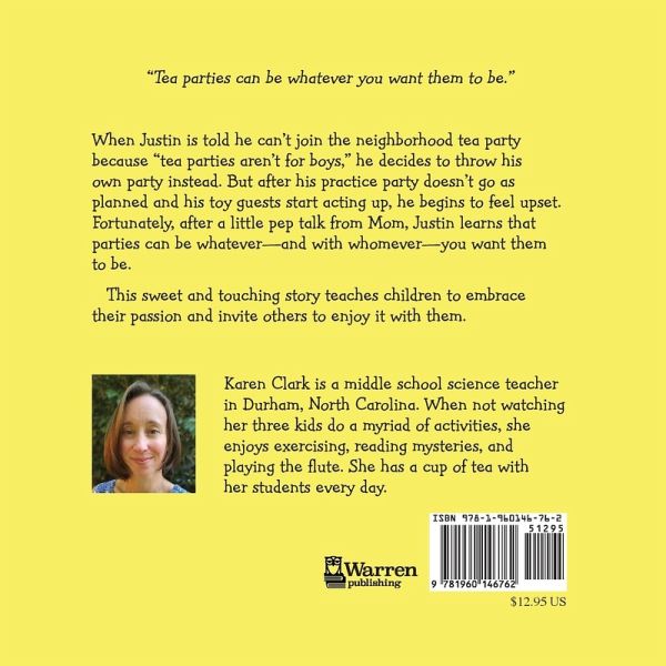 When Justin is told he can't join the neighborhood tea party because "tea parties aren't for boys," he decides to throw his own party instead. But after his practice party doesn't go as planned and his toy guests start acting up, he begins to feel upset. Fortunately, after a little pep talk from Mom, Justin learns that parties can be whatever-and with whomever-you want them to be. This sweet and touching story teaches children to embrace their passion and invite others to enjoy it with them.