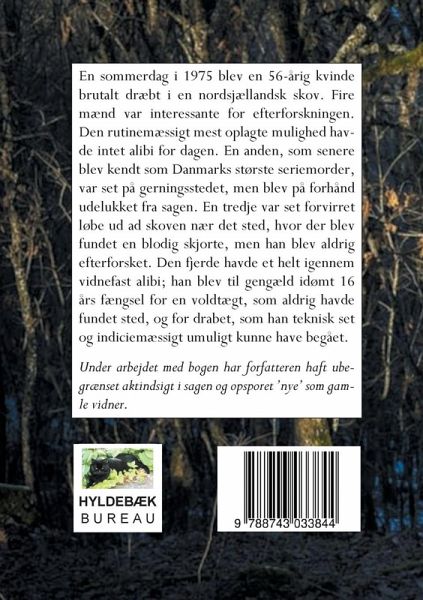 En sommerdag i 1975 blev en 56-årig kvinde brutalt dræbt i en nordsjællandsk skov. Fire mænd var interessante for efterforskningen. Den rutinemæssigt mest oplagte mulighed havde intet alibi for dagen. En anden, som senere blev kendt som Danmarks største seriemorder, var set på gerningsstedet, men blev på forhånd udelukket fra sagen. En tredje var set forvirret løbe ud ad skoven nær det sted, hvor der blev fundet en blodig skjorte, men han blev aldrig efterforsket. Den fjerde havde et helt igennem vidnefast alibi; han blev til gengæld idømt 16 års fængsel for en voldtægt, som aldrig havde fundet sted, og for drabet, som han teknisk set og indiciemæssigt umuligt kunne havde begået. Under arbejdet har forfatteren haft ubegrænset aktindsigt i sagen og ført samtaler med 'nye' som gamle vidner.
