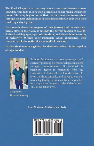 The Final Chapter is a true story about a romance between a man, Brandon, who falls in love with a Brazilian social media influencer, Junior. The story begins on the first day they meet and follows them through the next eight months of their relationship. It ends with their final tragic day together. Each month shows the prgress of their journey and the role social media plays in their love. It oulines the current fashion of LGBTQ dating involving apps, open relationships, and the evolving meanining of exclusivity. Witness their passionate sexual experience, their romance, explosive outbreaks, and multiple vacations. In their final months together, feel their love before it is destroyed by a tragic accident.