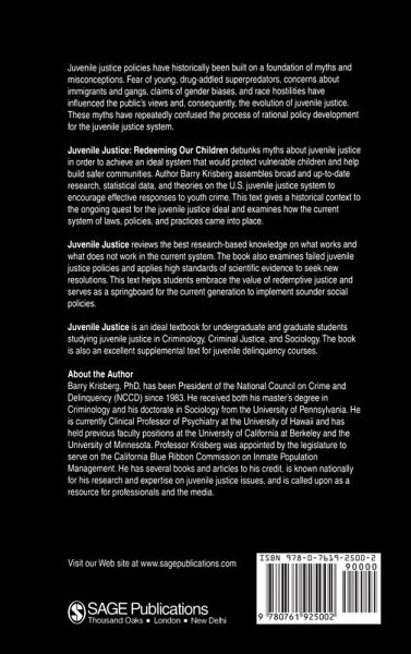 Juvenile Justice: Redeeming Our Children debunks myths about juvenile justice in order to achieve an ideal system that would protect vulnerable children and help build safer communities. Author Barry Krisberg assembles broad and up-to-date research, statistical data, and theories on the U.S. juvenile justice system to encourage effective responses to youth crime. This text gives a historical context to the ongoing quest for the juvenile justice ideal and examines how the current system of laws, policies, and practices came into place.