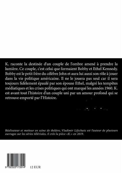 K. raconte la destinée d'un couple de l'ombre amené à prendre la lumière. Ce couple, c'est celui que formaient Bobby et Ethel Kennedy. Bobby est le petit frère du célèbre John et aura lui aussi son rôle à jouer dans la vie politique américaine. Il ne le jouera pas seul car il sera toujours fidèlement épaulé par son épouse Ethel, malgré les tempêtes médiatiques et les crises politiques qui ont marqué les années 1960. K. est avant tout l'histoire d'un couple uni par un amour profond qui se retrouve emporté par l'Histoire.