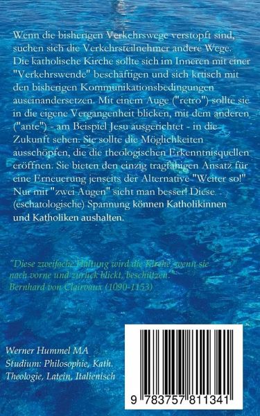 Wenn die bisherigen Verkehrswege verstopft sind, suchen sich die Verkehrsteilnehmer andere Wege. Die katholische Kirche sollte sich im Innern, der Struktur nach, um eine "Verkehrswende" kümmern, die den katholischen Reichtum ihre Tradtion für möglichst viele Menschen deutlich macht, nicht um der Vergangenheit willen, sondern im Blick auf die Gegenwart und Zukunft vieler Menschen, die sich zunehmend ihrer inneren Verletzlichkeit bewusst werden. Ein Auge soll dabei in die Vergangenheit ("retro") blicken, das andere in die "Zukunft" ("ante"), um zu erkennen, dass die Tradition der theologischen Erkenntnislehre Wege aus der systemischen Krise bietet. Die Konzentration auf Heilungserzählungen im Neuen Testament verdeutlicht, dass Jesus der Ausgangspunkt einer mehrsinnlichen Erneuerung der Kirche ist. Mit den beiden Augen des Glaubens (Tradition und Zukunft) sieht man auch heute besser. Ein einfaches "Weiter so" kann es angesichts der gegenwärtigen Lage der Kirchen nicht geben. Nur ein"katholisch", das die Lage analysiert ("aha") und Folgerungen daraus zieht ("aha!"), wird auch in Zukunft Bedeutsamkeit erreichen und auf Resonanz stoßen.
