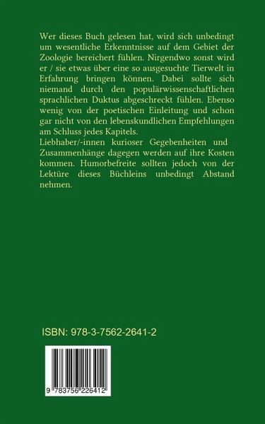 Unsere Welt ist trotz umfassender Forschung auf allen Fachgebieten immer noch nicht vollständig wissenschaftlich erfasst. Es gibt da zum Beispiel viele Tierarten, die entweder noch unbekannt oder schon wieder vergessen sind. Diesen sehr besonderen Tieren widmet sich dieses Buch. mit einem Augenzwinkern. Dabei kommt so manch absonderliche Kuriosität zum Vorschein. In jedem Fall aber wird im Zuge dessen auf humorvolle Weise ein nicht unerheblicher Erkenntniszuwachs bei Leser und Leserin erreicht. Nicht zuletzt aber werden wertvolle lebenskundliche Tipps am Ende jedes Kapitels vermittelt.
