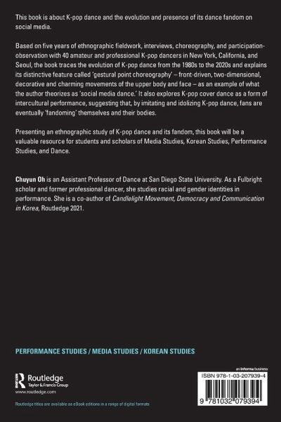 Based on five years of ethnographic fieldwork, interviews, choreography, and participation-observation with 40 amateur and professional K-pop dancers in New York, California, and Seoul, the book traces the evolution of K-pop dance from the 1980s to the 2020s and explains its distinctive feature called 'gestural point choreography' - front-driven, two-dimensional, decorative and charming movements of the upper body and face - as an example of what the author theorizes as 'social media dance.' It also explores K-pop cover dance as a form of intercultural performance, suggesting that, by imitating and idolizing K-pop dance, fans are eventually 'fandoming' themselves and their bodies.