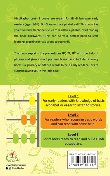 Beautiful images and simple text to introduce kids to Hindi vocabulary with a focus on the prepositions ka, ke and ki. Relatable everyday objects to spark curiosity for language learning.