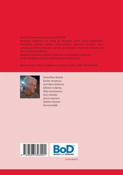 Justin Larma maalaa sanoilla. Runoissa arkipäivä tosi muuttuu usein myös fantasiaksi. Kirjoitettu siivittyy mielen kokemuksiksi, ajatuksen virraksi, jossa sulautuvat yhteen ihminen, luonto ja elämisen ympäristöt ihmisen eri ikä- ja murrosvaiheissa.