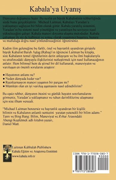 Manevi Doyumun Rehber I¿¿¿¿ Dünyan¿z de¿i¿meye haz¿r. Bu neslin en büyük Kabalistinin rehberli¿inde sizde bunu gerçekle¿tirin. Micheal Laitman, Kabalay¿ Yaradan'a yaklämay¿ sälayan bir bilim olarak görür. Kabala yarat¿l¿¿ sistemini, Yaradan'¿n bu sistemi nas¿l yönetti¿ini ve yarat¿l¿¿¿n bu seviyeye nas¿l yükselece¿ini çal¿¿¿r. Kabala manevi doyuma uläma metodudur. Kabala çal¿¿mas¿ ile siz de kalbinizi ve sonuç olarak yäam¿n¿z bäar¿ya, huzura ve mutlulüa döru nas¿l yönlendirece¿inizi ö¿renirsiniz. Kadim ilim gelene¿ine bu farkl¿, özel ve hayranl¿k uyand¿ran giri¿iyle büyük Kabalist Baruh A¿lag (Rabä)'¿n ö¿rencisi Laitman bu kitapta, size Kabalan¿n temel ö¿retilerinin derin anlay¿¿¿n¿ ve bu ilmi bäkalar¿yla ve etraf¿n¿zdaki dünyayla ili¿kilerinizi netle¿tirmek için nas¿l kullanacä¿n¿z¿ anlat¿r. Hem bilimsel hem de ¿iirsel bir dil kullanarak, maneviyat¿n ve varolüun en önemli sorular¿n¿ arät¿r¿r: Hayat¿m¿n anlam¿ ne? Neden dünyada keder var? Reenkarnasyon manevi yäam¿n bir parças¿ m¿? Mümkün olan en iyi varolü äamas¿n¿ nas¿l edinebilirim? Bu e¿siz rehber, dünyan¿n ötesini ve günlük hayat¿n s¿n¿rlamalar¿n¿ görmeniz, Yaradan'a yakläman¿z ve ruhun derinliklerine uläman¿z için size ilham verecek.