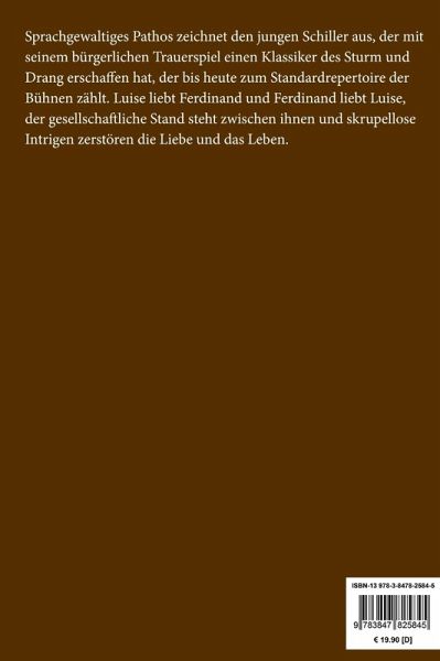 Friedrich Schiller: Kabale und Liebe. Ein bürgerliches Trauerspiel in fünf Aufzügen Lesefreundlicher Großdruck in 16-pt-Schrift Sprachgewaltiges Pathos zeichnet den jungen Schiller aus, der mit seinem bürgerlichen Trauerspiel einen Klassiker des Sturm und Drang erschaffen hat, der bis heute zum Standardrepertoire der Bühnen zählt. Luise liebt Ferdinand und Ferdinand liebt Luise, der gesellschaftliche Stand steht zwischen ihnen und skrupellose Intrigen zerstören die Liebe und das Leben. Großformat, 210 x 297 mm Berliner Ausgabe, 2019 Durchgesehener Neusatz mit einer Biographie des Autors bearbeitet und eingerichtet von Theodor Borken Entstanden 1782/83, Erstdruck: Mannheim (Schwan) 1784. Uraufführung 13.4.1784 in Frankfurt am Main. Textgrundlage ist die Ausgabe: Friedrich Schiller: Sämtliche Werke, Auf Grund der Originaldrucke herausgegeben von Gerhard Fricke und Herbert G. Göpfert in Verbindung mit Herbert Stubenrauch, Band 1¿5, 3. Auflage, München: Hanser, 1962. Umschlaggestaltung von Thomas Schultz-Overhage. Gesetzt aus der Minion Pro, 16 pt.