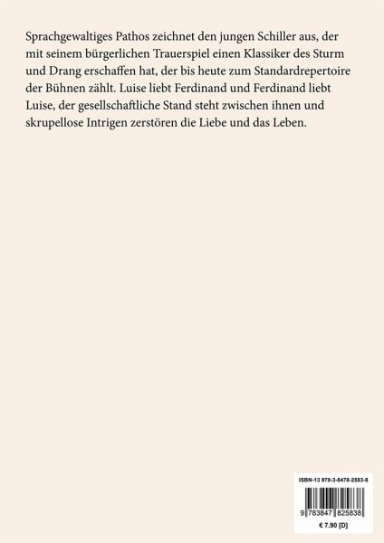 Friedrich Schiller: Kabale und Liebe. Ein bürgerliches Trauerspiel in fünf Aufzügen Lesefreundlicher Großdruck in 16-pt-Schrift Sprachgewaltiges Pathos zeichnet den jungen Schiller aus, der mit seinem bürgerlichen Trauerspiel einen Klassiker des Sturm und Drang erschaffen hat, der bis heute zum Standardrepertoire der Bühnen zählt. Luise liebt Ferdinand und Ferdinand liebt Luise, der gesellschaftliche Stand steht zwischen ihnen und skrupellose Intrigen zerstören die Liebe und das Leben. Großformat, 210 x 297 mm Berliner Ausgabe, 2019 Durchgesehener Neusatz mit einer Biographie des Autors bearbeitet und eingerichtet von Theodor Borken Entstanden 1782/83, Erstdruck: Mannheim (Schwan) 1784. Uraufführung 13.4.1784 in Frankfurt am Main. Textgrundlage ist die Ausgabe: Friedrich Schiller: Sämtliche Werke, Auf Grund der Originaldrucke herausgegeben von Gerhard Fricke und Herbert G. Göpfert in Verbindung mit Herbert Stubenrauch, Band 1¿5, 3. Auflage, München: Hanser, 1962. Umschlaggestaltung von Thomas Schultz-Overhage. Gesetzt aus der Minion Pro, 16 pt. Henricus Edition Deutsche Klassik UG (haftungsbeschränkt)