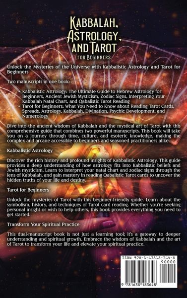 Unlock the Mysteries of the Universe with Kabbalistic Astrology and Tarot for Beginners Two manuscripts in one book:Kabbalistic Astrology: The Ultimate Guide to Hebrew Astrology for Beginners, Ancient Jewish Mysticism, Zodiac Signs, Interpreting Your Kabbalah Natal Chart, and Qabalistic Tarot Reading Tarot for Beginners: What You Need to Know about Reading Tarot Cards, Spreads, Astrology, Kabbalah, Divination, Psychic Development, and Numerology Kabbalistic Astrology Discover the rich history and profound insights of Kabbalistic Astrology. This guide provides a deep understanding of how astrology fits into Kabbalistic beliefs and Jewish mysticism. Learn to interpret your natal chart and zodiac signs through the lens of Kabbalah, and gain mastery in reading Qabalistic Tarot cards to uncover the hidden truths of your life and destiny. In this part, you will:Read Kabbalah natal charts: Uncover the secrets written in the stars about your personality and fate. Interpret Qabalistic Tarot cards: Gain profound insights into every aspect of your life. Explore Jewish mysticism: Understand the esoteric traditions that have shaped Kabbalah. Learn about the Kabbalistic Tree of Life: Discover the symbolic representation of the universe and the human soul. Trace the history and evolution of Kabbalah: From its ancient roots to its modern-day practices. See how astrology integrates with Kabbalah: Delve into the celestial influences that affect your spiritual journey. Tarot for Beginners Unlock the mysteries of Tarot with this beginner-friendly guide. Learn about the symbolism, history, and techniques of Tarot card reading. Whether you're seeking personal insight or wish to help others, this book provides everything you need to get started. In this part, you will:Discover the essence of Tarot cards: Learn what they are and how they are used in divination. Understand the origins of Tarot as a divination tool: Trace its journey from playing cards to spiritual guides. Develop your psychic powers: Enhance your intuitive abilities to improve your readings. Connect Tarot with other mystical systems: See how Tarot intertwines with Kabbalah, numerology, and astrology. Meet the Major and Minor Arcana cards: Learn the meanings and interpretations of each card. Perform accurate Tarot readings: Gain confidence in your ability to provide insightful guidance. Explore various Tarot spreads and layouts: Find the perfect spread for any question or situation.