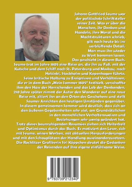 Johann Gottfried Seume war wohl der politischste Schriftsteller seiner Zeit. Was er über die Menschen, ihr Denken und Handeln, ihre Moral und Herrschaftsmechanismen niederschrieb, gilt noch heutzutage bis ins verblüffende Detail.Man muss ihn wieder zu Wort kommen lassen. Das geschieht in diesem Buch.Seume trat im Jahre 1805 eine Reise an, die ihn zu Fuß, mit der Kutsche und dem Schiff nach St. Petersburg und Moskau, nach Helsinki, Stockholm und Kopenhagen führte. Seine kritische Haltung zu Ereignissen und Verhältnissen, die er in dem Buch "Mein Sommer 1805" niederschrieb, verschaffte ihm den Hass der Herrschenden und das Lob der Denkenden. 210 Jahre später nimmt der Autor den Wanderer auf eine neue Reise mit, zitiert ihn an den Orten des Geschehens und stellt Seumes Ansichten den heutigen Umständen gegenüber. Nach diesem gemeinsamen Sommer steht fest, dass sich an den äußeren Gegebenheiten sehr viel, am Grundsätzlichen in den menschlichen Verhaltensweisen und Beziehungen sehr wenig geändert hat.Trotz dieses beunruhigenden Resumées ziehen sich Heiterkeit und Optimismus durch das Buch. Es motiviert den Leser, sich mit Seume und seinen Werken, aber auch mit der heutigen Zeit und mit den Schauplätzen der Handlung vertraut zu machen.