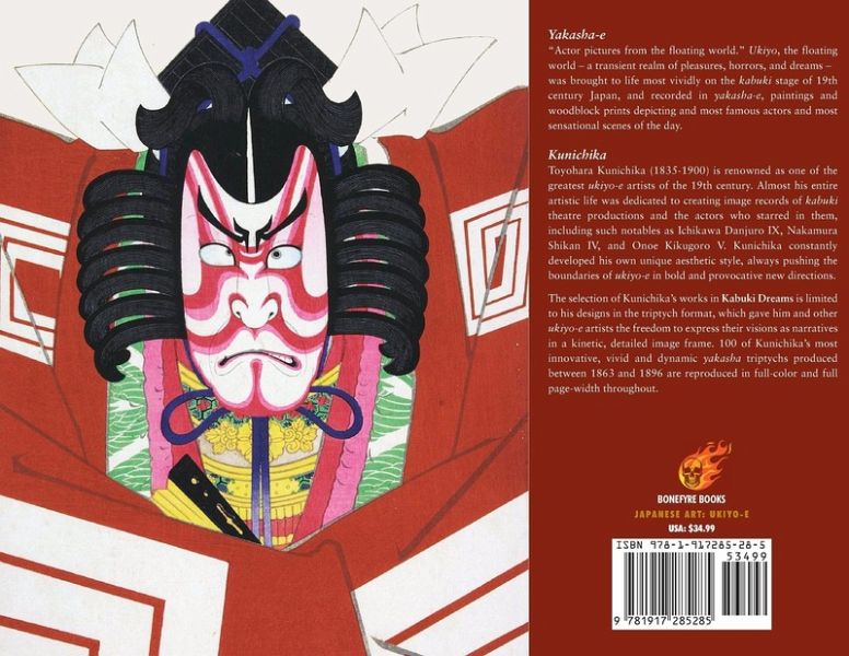 Yakasha-e: "Actor pictures from the floating world." Ukiyo, the floating world - a transient realm of pleasures, horrors, and dreams - was brought to life most vividly on the kabuki stage of 19th century Japan, and recorded in yakasha-e, paintings and woodblock prints depicting and most famous actors and most sensational scenes of the day. Perhaps the most famous of all purveyors of yakasha-e was Toyohara Kunichika (1835-1900), renowned as one of the greatest ukiyo-e artists of the 19th century. Almost his entire artistic life was dedicated to creating image records of kabuki theatre productions and the actors who starred in them, including such notables as Ichikawa Danjuro IX, Nakamura Shikan IV, and Onoe Kikugoro V. Kunichika constantly developed his own unique aesthetic style, always pushing the boundaries of ukiyo-e in bold and provocative new directions. The selection of Kunichika's works in KABUKI DREAMS is limited to his designs in the triptych format, which gave him and other ukiyo-e artists the freedom to express their visions as narratives in a kinetic, detailed image frame. 100 of Kunichika's most innovative, vivid and dynamic yakasha triptychs produced between 1863 and 1896 are reproduced in full-color and full page-width throughout.