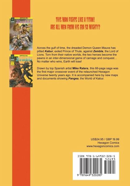 Across the gulf of time, the dreaded Demon Queen Mauve has pitted Kabur, exiled Prince of Thule, against Zembla, the Lord of Lions. Torn from their native worlds, the two heroes become the pawns in an inter-dimensional game of carnage and conquest... No matter who wins, Earth will lose! Drawn by top Spanish artist Mike Ratera, this 66-page saga was the first major crossover event of the relaunched Hexagon Universe twenty years ago. It is accompanied here by new maps and documents showing Pangea, the World of Kabur.