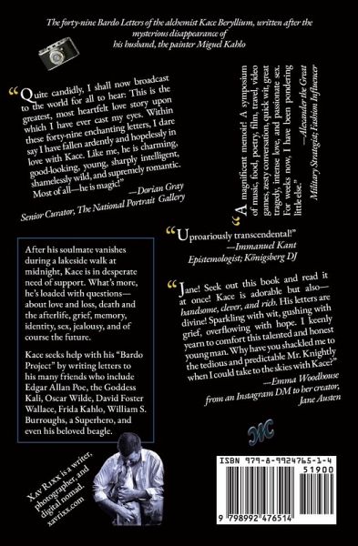 The forty-nine Bardo Letters of the alchemist Kace Beryllium, written after the mysterious disappearance of his husband, the painter Miguel Kahlo. After his soulmate vanishes during a lakeside walk at midnight, Kace is in desperate need of support. What's more, he's loaded with questions-about love and loss, death and the afterlife, grief, memory, identity, sex, jealousy, and of course the future. Kace seeks help with his "Bardo Project" by writing letters to his many friends who include Edgar Allan Poe, the Goddess Kali, William S. Burroughs, Oscar Wilde, David Foster Wallace, Frida Kahlo, a Superhero, and even his beloved beagle.