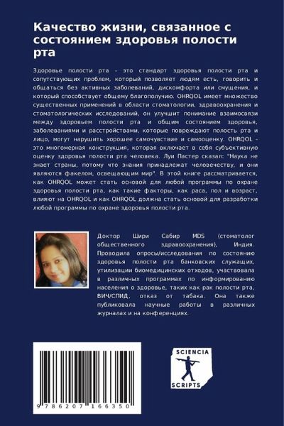 Zdorow'e polosti rta - äto standart zdorow'q polosti rta i soputstwuüschih problem, kotoryj pozwolqet lüdqm est', goworit' i obschat'sq bez aktiwnyh zabolewanij, diskomforta ili smuscheniq, i kotoryj sposobstwuet obschemu blagopoluchiü. OHRQOL imeet mnozhestwo suschestwennyh primenenij w oblasti stomatologii, zdrawoohraneniq i stomatologicheskih issledowanij, on uluchshit ponimanie wzaimoswqzi mezhdu zdorow'em polosti rta i obschim sostoqniem zdorow'q, zabolewaniqmi i rasstrojstwami, kotorye powrezhdaüt polost' rta i lico, mogut narushit' horoshee samochuwstwie i samoocenku. OHRQOL - äto mnogomernaq konstrukciq, kotoraq wklüchaet w sebq sub#ektiwnuü ocenku zdorow'q polosti rta cheloweka. Lui Paster skazal: "Nauka ne znaet strany, potomu chto znaniq prinadlezhat chelowechestwu, i oni qwlqütsq fakelom, osweschaüschim mir". V ätoj knige rassmatriwaetsq, kak OHRQOL mozhet stat' osnowoj dlq lüboj programmy po ohrane zdorow'q polosti rta, kak takie faktory, kak rasa, pol i wozrast, wliqüt na OHRQOL i kak OHRQOL dolzhna stat' osnowoj dlq razrabotki lüboj programmy po ohrane zdorow'q polosti rta.