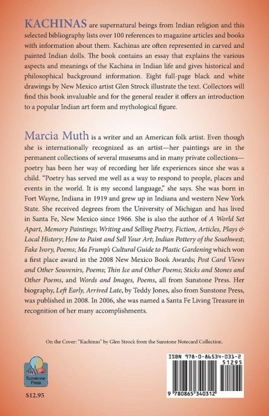 Kachinas are supernatural beings from Indian religion and this selected bibliography lists over 100 references to magazine articles and books with information about them. Kachinas are often represented in carved and painted Indian dolls. The book contains an essay that explains the various aspects and meanings of the Kachina in Indian life and gives historical and philosophical background information. Eight full-page black and white drawings by New Mexico artist Glen Strock illustrate the text. Collectors will find this book invaluable and for the general reader it offers an introduction to a popular Indian art form and mythological figure. * * * * * Marcia Muth was a writer and an American folk artist. Even though she is internationally recognized as an artist-her paintings are in the permanent collections of several museums and in many private collections-poetry was her way of recording her life experiences since she was a child. "Poetry has served me well as a way to respond to people, places and events in the world. It is my second language," she said. She was born in Fort Wayne, Indiana in 1919 and grew up in Indiana and western New York State. She received degrees from the University of Michigan and lived in Santa Fe, New Mexico. She is also the author of "A World Set Apart, Memory Paintings"; "Writing and Selling Poetry, Fiction, Articles, Plays & Local History"; "How to Paint and Sell Your Art"; "Indian Pottery of the Southwest"; "Fake Ivory, Poems"; "Ma Frump's Cultural Guide to Plastic Gardening" which won a first place award in the 2008 New Mexico Book Awards; "Post Card Views and Other Souvenirs, Poems"; "Thin Ice and Other Poems"; "Sticks and Stones and Other Poems," and "Words and Images, Poems," all from Sunstone Press. Her biography, "Left Early, Arrived Late," by Teddy Jones, was also published by Sunstone Press She has been named a Santa Fe Living Treasure in recognition of her many accomplishments.
