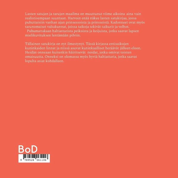 Lasten satujen ja tarujen maailma on muuttunut viime aikoina aina vain realistisempaan suuntaan. Harvoin enää näkee lasten satukirjaa, jossa puhuttaisiin vanhan ajan prinsessoista ja prinsseistä. Kadonneet ovat myös tarunomaiset valtakunnat, joissa taikoja tekivät taikurit ja velhot. Puhumattakaan haltiattarista peikoista ja keijuista, jotka saavat lapsen mielikuvituksen lentämään pilviin. Tällainen satukirja on nyt ilmestynyt. Tässä kirjassa entisaikojen kuninkaiden linnat ja niissä asuvat kuninkaalliset heräävät jälleen eloon. Heidän onneaan kuitenkin häiritsevät noidat, jotka omivat toisten omaisuutta. Onneksi on olemassa myös hyviä haltiattaria, jotka saavat lopulta asiat kohdalleen.