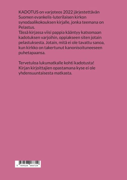 KADOTUS on varjoteos 2022 järjestettävän Suomen ev-lut. kirkon synodaalikokouksen kirjalle, jonka teemana on Pelastus. Kirjassa viisi pappia kääntyy katsomaan kadotuksen varjoihin, oppiakseen siten jotain pelastuksesta. Jotain, mitä ei ole tavattu sanoa, kun kirkko on takertunut kanonisoituneeseen puhetapaansa. Tervetuloa lukumatkalle kohti kadotusta! Kirjan kirjoittajien opastamana kyse ei ole yhdensuuntaisesta matkasta.
