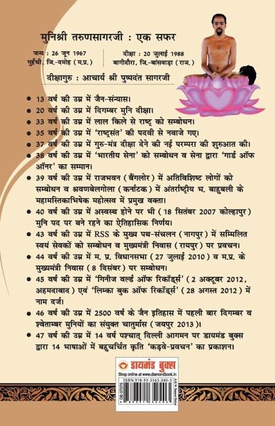 Munishree Tarunsagar ji is a legendary Jain saint whose explosive proclamation to throw open the access to Bhagawan Mahaveer by bringing him out from the corridors and sanctum sanatorium of the temple created a commotion. How is he such a phenomenal saint that even the non-Jains throng to listen to his discourses and bestow on him the title of National Saint? He is such a legendary orator whose discourses can be scathing and fiery and at the same time act like a soothing balm and touch the inner chord of the devotees' hearts. He is a miraculous personality who attracts the masses, celebrities, politicians and artists alike or he is such a personality who has taken birth on this earth to be renowned worldwide in the Guinness Book of World Records and Limca Book of World Records. One has to spend one's entire lifetime in order to understand him and his contribution to mankind.