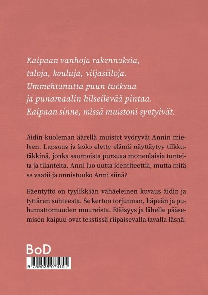 Kaipaan vanhoja rakennuksia, taloja, kouluja, viljasiiloja. Ummehtunutta puun tuoksua ja punamaalin hilseilevää pintaa. Kaipaan sinne, missä muistoni syntyivät. Äidin kuoleman äärellä muistot vyöryvät Annin mieleen. Lapsuus ja koko eletty elämä näyttäytyy tilkkutäkkinä, jonka saumoista pursuaa monenlaisia tunteita ja tilanteita. Käentyttö on kuvaus äidin ja tyttären suhteesta. Se kertoo torjunnan, häpeän ja puhumattomuuden muureista. Se kertoo myös etäisyydestä ja lähelle pääsemisen kaipuusta.