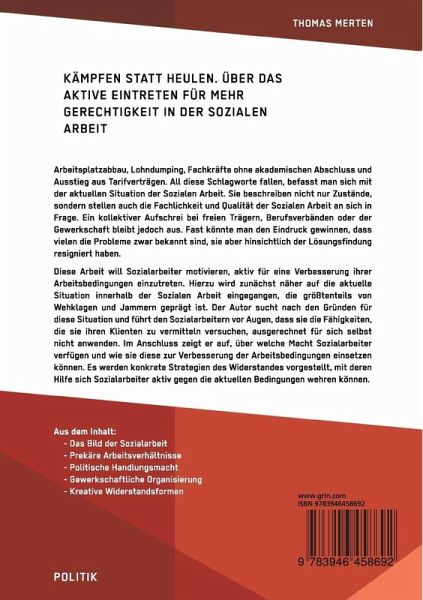 Arbeitsplatzabbau, Lohndumping, Fachkräfte ohne akademischen Abschluss und Ausstieg aus Tarifverträgen. All diese Schlagworte fallen, befasst man sich mit der aktuellen Situation der Sozialen Arbeit. Sie beschreiben nicht nur Zustände, sondern stellen auch die Fachlichkeit und Qualität der Sozialen Arbeit an sich in Frage. Ein kollektiver Aufschrei bei freien Trägern, Berufsverbänden oder der Gewerkschaft bleibt jedoch aus. Fast könnte man den Eindruck gewinnen, dass vielen die Probleme zwar bekannt sind, sie aber hinsichtlich der Lösungsfindung resigniert haben. Diese Arbeit will Sozialarbeiter motivieren, aktiv für eine Verbesserung ihrer Arbeitsbedingungen einzutreten. Hierzu wird zunächst näher auf die aktuelle Situation innerhalb der Sozialen Arbeit eingegangen, die größtenteils von Wehklagen und Jammern geprägt ist. Der Autor sucht nach den Gründen für diese Situation und führt den Sozialarbeitern vor Augen, dass sie die Fähigkeiten, die sie ihren Klienten zu vermitteln versuchen, ausgerechnet für sich selbst nicht anwenden. Im Anschluss zeigt er auf, über welche Macht Sozialarbeiter verfügen und wie sie diese zur Verbesserung der Arbeitsbedingungen einsetzen können. Es werden konkrete Strategien des Widerstandes vorgestellt, mit deren Hilfe sich Sozialarbeiter aktiv gegen die aktuellen Bedingungen wehren können.Aus dem Inhalt:-Das Bild der Sozialarbeit;-Prekäre Arbeitsverhältnisse;-Politische Handlungsmacht;-Gewerkschaftliche Organisierung;-Kreative Widerstandsformen