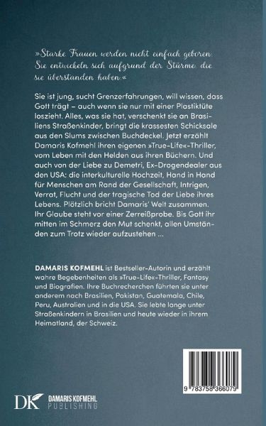 Sie ist jung, sucht Grenzerfahrungen, will wissen, dass Gott trägt - auch wenn sie nur mit einer Plastiktüte loszieht. Alles, was sie hat, verschenkt sie an Brasiliens Strassenkinder, bringt die krassesten Schicksale aus den Slums zwischen Buchdeckel. Jetzt erzählt Damaris Kofmehl ihren eigenen "True Life Thriller", vom Leben mit den Helden aus ihren Büchern. Und auch von der Liebe zu Demetri, Ex-Drogendealer aus den USA: die interkulturelle Hochzeit, Hand in Hand für Menschen am Rand der Gesellschaft, Intrigen, Verrat, Flucht und der tragische Tod der Liebe ihres Lebens. Plötzlich bricht Damaris´ Welt zusammen. Ihr Glaube steht vor einer Zerreissprobe. Bis Gott ihr mitten im Schmerz den Mut schenkt, allen Umständen zum Trotz wieder aufzustehen ...