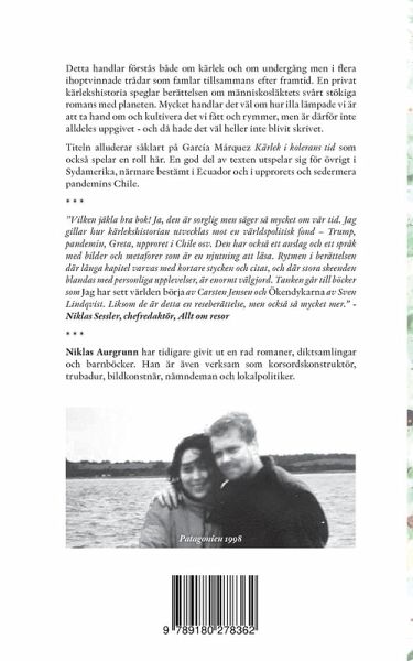 Det handlar förstås både om kärlek och om undergång, men i flera ihoptvinnade trådar som famlar tillsammans efter framtid. En privat kärlekshistoria speglar berättelsen om människosläktets korta och kaotiska romans med planeten. Titeln alluderar på García Márquez roman "Kärlek i kolerans tid" som också spelar en roll här. En god del av texten utspelar sig för övrigt i Sydamerika, närmare bestämt i Ecuador och i upprorets och sedermera pandemins Chile.