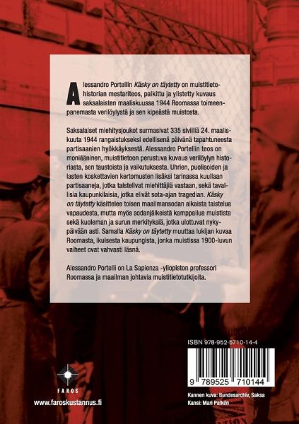 Alessandro Portellin Käsky on täytetty on muistitietohistorian mestariteos, palkittu ja ylistetty kuvaus saksalaisten maaliskuussa 1944 Roomassa toimeenpanemasta verilöylystä ja sen kipeästä muistosta. Saksalaiset miehitysjoukot surmasivat 335 siviiliä 24. maaliskuuta 1944 rangaistukseksi edellisenä päivänä tapahtuneesta partisaanien hyökkäyksestä. Alessandro Portellin teos on moniääninen, muistitietoon perustuva kuvaus verilöylyn historiasta, sen taustoista ja vaikutuksesta. Uhrien, puolisoiden ja lasten koskettavien kertomusten lisäksi tarinassa kuullaan partisaaneja, jotka taistelivat miehittäjiä vastaan, sekä tavallisia kaupunkilaisia, jotka elivät sota-ajan tragedian. Käsky on täytetty käsittelee toisen maailmansodan aikaista taistelua vapaudesta, mutta myös sodanjälkeistä kamppailua muistista sekä kuoleman ja surun merkityksiä, jotka ulottuvat nykypäivään asti. Samalla Käsky on täytetty muuttaa lukijan kuvaa Roomasta, ikuisesta kaupungista, jonka muistissa 1900-luvun vaiheet ovat vahvasti läsnä.