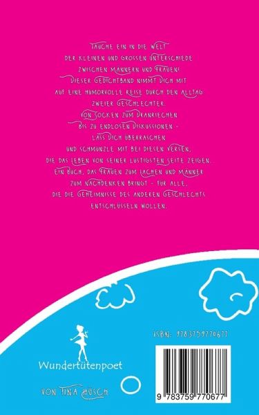 Tauche ein in die Welt der kleinen und großen Unterschiede zwischen Männern und Frauen! Dieser Gedichtband nimmt Dich mit auf eine humorvolle Reise durch den Alltag zweier Geschlechter. Von Socken zum Dranriechen bis zu endlosen Diskussionen - lass Dich überraschen und schmunzle mit bei diesen Versen, die das Leben von seiner lustigsten Seite zeigen. Ein Buch, das Frauen zum Lachen und Männer zum Nachdenken bringt - für alle, die die Geheimnisse des anderen Geschlechts entschlüsseln wollen.