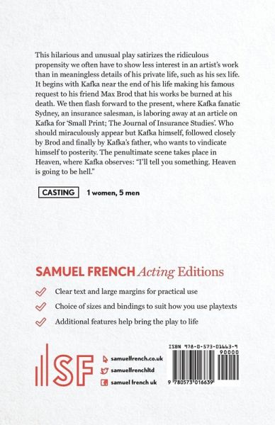 This hilarious and unusual play satirizes the ridiculous propensity we often have to show less interest in an artist's work than in meaningless details of his private life, such as his sex life. It begins with Kafka near the end of his life making his famous request to his friend Max Brod that his works be burned at his death. We then flash forward to the present, where Kafka fanatic Sydney, an insurance salesman, is laboring away at an article on Kafka for 'Small Print; The Journal of Insurance Studies'. Who should miraculously appear but Kafka himself, followed closely by Brod and finally by Kafka's father, who wants to vindicate himself to posterity. The penultimate scene takes place in Heaven, where Kafka observes: "I'll tell you something. Heaven is going to be hell."