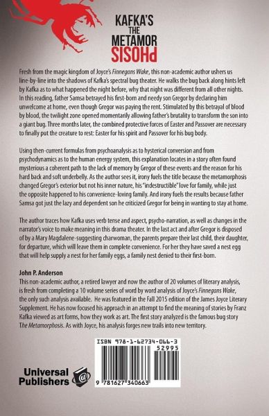 Fresh from the magic kingdom of Joyce's Finnegans Wake, this non-academic author ushers us line-by-line into the shadows of Kafka's spectral bug theater. He walks the bug back along hints left by Kafka as to what happened the night before, why that night was different from all other nights. In this reading, father Samsa betrayed his first-born and needy son Gregor by declaring him unwelcome at home, even though Gregor was paying the rent. Stimulated by this betrayal of blood by blood, the twilight zone opened momentarily allowing father's brutality to transform the son into a giant bug. Three months later, the combined protective forces of Easter and Passover are necessary to finally put the creature to rest: Easter for his spirit and Passover for his bug body. Using then-current formulas from psychoanalysis as to hysterical conversion and from psychodynamics as to the human energy system, this explanation locates in a story often found mysterious a coherent path to the lack of memory by Gregor of these events and the reason for his hard back and soft underbelly. As the author sees it, irony fuels the title because the metamorphosis changed Gregor's exterior but not his inner nature, his "indestructible" love for family, while just the opposite happened to his convenience-loving family. And irony fuels the results because father Samsa got just the lazy and dependent son he criticized Gregor for being in wanting to stay at home. The author traces how Kafka uses verb tense and aspect, psycho-narration, as well as changes in the narrator's voice to make meaning in this drama theater. In the last act and after Gregor is disposed of by a Mary Magdalene-suggesting charwoman, the parents prepare their last child, their daughter, for departure, which will leave them in complete convenience. For her they have saved a nest egg that will help supply a nest for her family eggs, a family nest denied to their first-born.