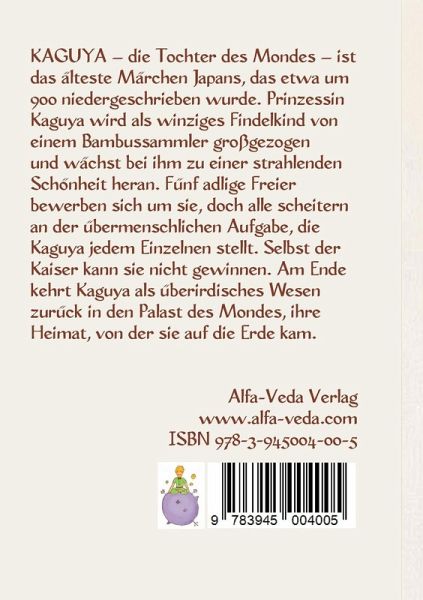Kaguya - die Tochter des Mondes - ist das älteste Märchen Japans, das etwa um 900 niedergeschrieben wurde. Prinzessin Kaguya wird als winziges Findelkind von einem Bambussammler großgezogen und wächst bei ihm zu einer strahlenden Schönheit heran. Fünf adlige Freier bewerben sich um sie, doch alle scheitern an der übermenschlichen Aufgabe, die Kaguya jedem Einzelnen stellt. Selbst der Kaiser kann sie nicht gewinnen. Am Ende kehrt Kaguya als überirdisches Wesen zurück in den Palast des Mondes, ihre Heimat, von der sie auf die Erde kam.